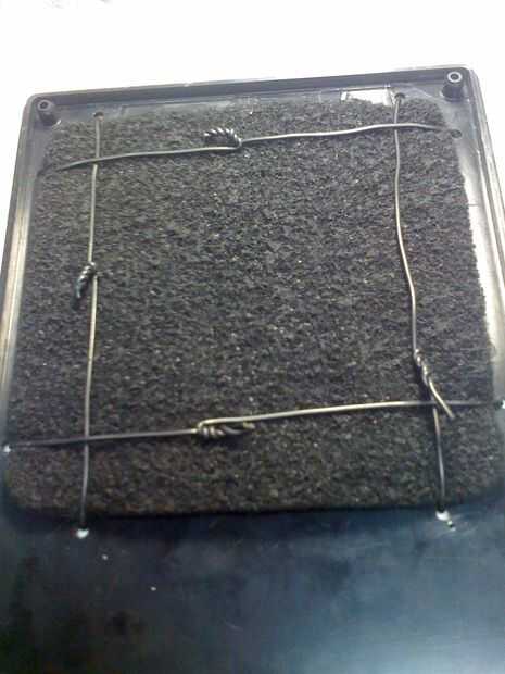 Sólo usé cableado cobre negro para fijar el filtro porque tenía un carrete grande de él. Originalmente había planeado hacer un soporte más de lujo en el interior, pero el se dio cuenta el cable bloquearía menos el flujo de aire.
