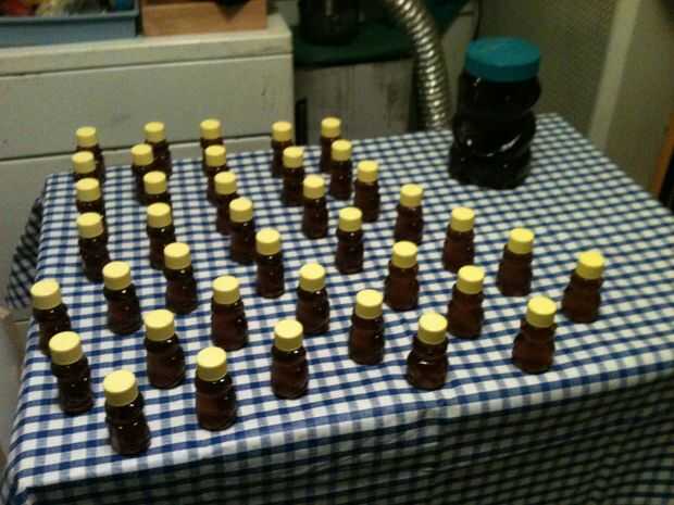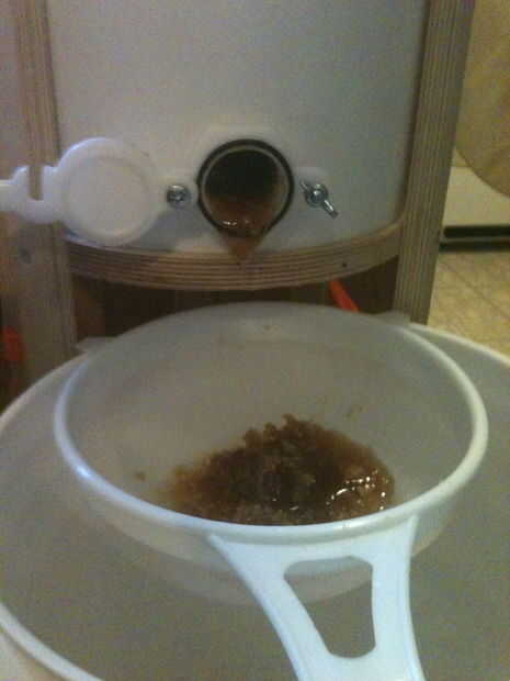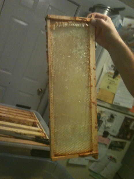 La extracción fue como sigue: coloqué los marcos en el nock abajo tabla sobre colgando en el lado opuesto de la mesa de la campana y colocar un calefactor debajo de ellos. (se fue haciendo lo suficientemente fría para hacer la miel realmente gruesa. las abejas como para mantener la colmena por encima de 90 grados.) El calentador realmente ayudó a como el primer fotograma que apagó, cuando he intentado extraerlos. Mi pan destapar fue centro de la mesa. Me Destape los dos cuadros sobre la estufa y colocar en el extractor. Entonces movería los siguiente fotogramas sobre el calentador. Enciendo el rotor a mano (no con el mango) deslizando mis manos más allá de uno a otro con la varilla roscada entre ellos (Lucky no corté la varilla) el mango era una relación de 1 a 1 que no era lo suficientemente rápida. quisiera girar más de la miel hacia fuera y luego se detiene y voltear los cuadros, como los marcos son dos caras y ambos lados se necesitan. No ir demasiado rápido o los marcos se desequilibre y soplará el peine (ha la hecho que) con la mayoría de la miel quitada luego le sujete el taladro y girar a una velocidad baja por 1 o 2 min. El marco de la vuelta y repetir con el taladro. El filtro sólo usé era un colador en la tienda de dólar. Esto consiguió la cera más hacia fuera y el resto se flotan a la parte superior. Los marcos consiguieron muy limpios. Cuando les di vuelta a las abejas para limpiar, se llevaron toda la miel que pudieran encontrar y sólo llenan sólo aproximadamente 4 células. Repetí esto en 4 alzas de alrededor de 36 imágenes completas y consiguió 5 galones de miel. Yum llené 2oz 50 osos, los cuartos grandes + oso 11 cuartos y 12 frascos de lujo de 1lb.
