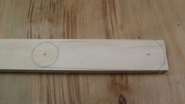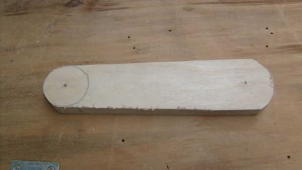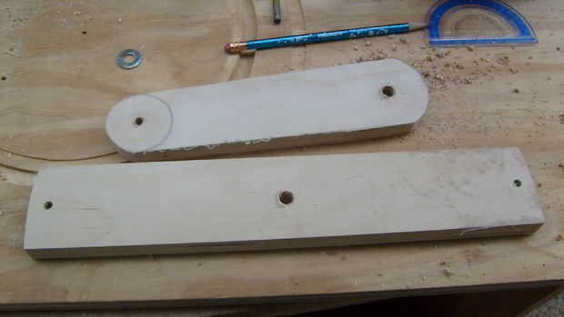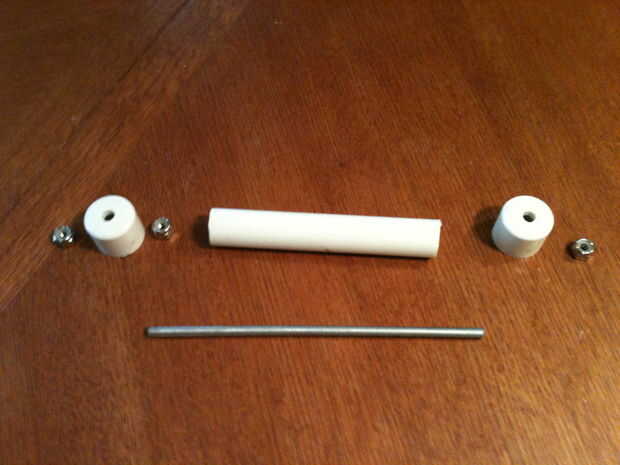 El mango es un trozo de PVC de cinco pulgadas con tapones que taladré agujeros en para que la varilla roscada en un perno podría haber sido también usada. dos tuercas van en los extremos con un final de 3/4 sobresale que fue rosca en el orificio en el lado más pequeño de la manija. Un suelto del agujero (3/4) estaba en el lado grande de la manija para pasar la rosca de 3/4 barra de la manija se mantiene en su lugar al igual que los discos.