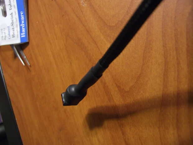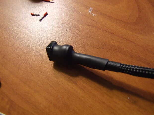 En este paso aplicamos una 1/2" diámetro x 1.5" calor shring tubo sobre nuestro enchufe de 2.5 milímetros. Ahora calentar sólo el 1/2" diámetro tubo que se coloca sobre el conector de alimentación. También sea cuidadoso no para derretir el conector como distorsionará el agujero dificultando la inserción y extracción del cable de alimentación. Si por casualidad se desvirtúan el conector que puede intentar salvar por recalentamiento del conector usando guantes hasta que sea flexible y el cable de alimentación de la inserción en el agujero, luego deje que se enfríe. El ajuste será muy apretado después de este proceso sin embargo girando el enchufe dentro del encaje será aflojarlo un poco. Una vez que usted tiene contrajo el 1/2" tubería alrededor del conector de alimentación que será probable que observe que no es exactamente ajustado. Esto es donde la 1 "x 3/8" pieza de tubería que se colocó en el cable entra en juego. Deslice el 3/8" tubería sobre el se redujo 1/2" tubería Tubería del encogimiento del entonces.