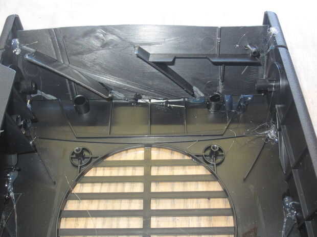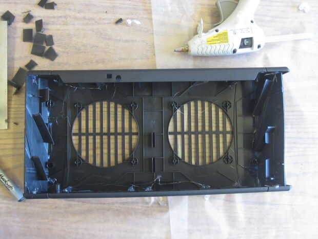 a continuación tienes que pegar los cuatro lados (superior, inferior, izquierda y derecha) a la pieza posterior. Se utilizó una pistola de pegamento caliente, porque era rápido y fácil. Cuando termine pegando, asegúrese de dejarlo todo seco antes de poner los ventiladores de nuevo en.