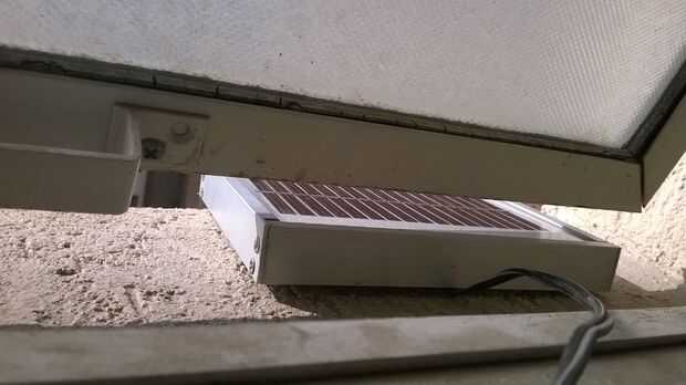 He escogido este lugar porque esto no será visible desde fuera el edificio aparente, así que no hay problema de estética. Sólo mantuve el PV hacia fuera en el piso del ventilador y los cables están dentro y conectados directamente con el ventilador de enfriamiento.