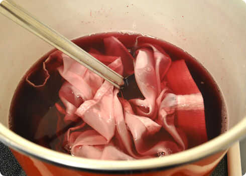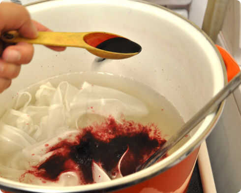 Mida la cantidad deseada de tinte, usamos 2 cucharadas para un tono medio ligeramente más oscuro. Revise las tablas en las fichas de instrucciones del producto sugerido más cantidades y recetas de mezcla de color. Añadir el colorante a la olla llenada de agua suficiente para que la tela se mueve fácilmente sin excesivas aglomeraciones. Agitar el bote para que el tinte se disperse uniformemente. Añadir la seda a la olla.