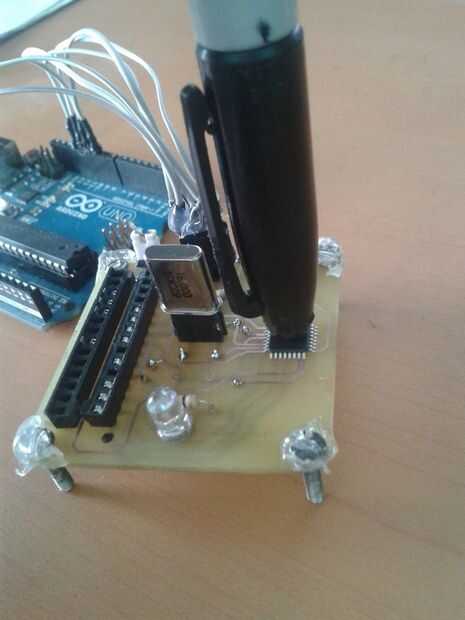 Sitúe el microcontrolador ATMEGA328P (en este caso se Co-autoriza uno en encapsulado SMD) sobre las pistas correspondientes (o en su base, si es usado uno con encapsulado PDIP) y presione con algún objeto que no danés al microcontrolador, esto con el objetivo de las patitas hagan contacto con las pistas (en este caso se hizo con un marcador).