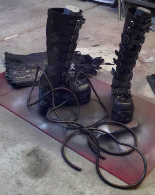 Mientras que la plantilla estaba mojada con pintura blanca, puso mojado-lado-abajo en los bordes de la parte inferior de la plataforma de arranque. Puse esa plantilla a un lado y agarró una de mis plantillas de texturas, pasando por toda la tela con pintura de cobre. Usé el lado húmedo de esta plantilla como un sello en lugares al azar en toda la zona de la pantorrilla de la bota. Volví sobre todo con un poco de negro y cobre más ensuciar el aspecto de los bordes blancos para verduras.