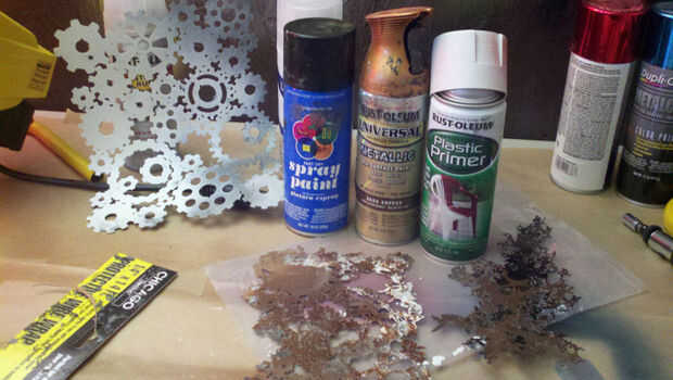 Puse mis cosas hacia fuera adyacentes uno al otro e hizo unos pases descuidados sobre todo con la pintura de cobre. Tenía una plantilla de engranaje modelado alrededor de 6 "x 10" que puse en varias áreas, rociar un poco de pintura blanca y plata. No quería que el patrón se muestran bien, por lo que me refiero a la niebla. (Esto, por supuesto, significa que las partículas de pintura volar alrededor de-clara el área alrededor de usted a menos que no te importa gotas de pintura.)