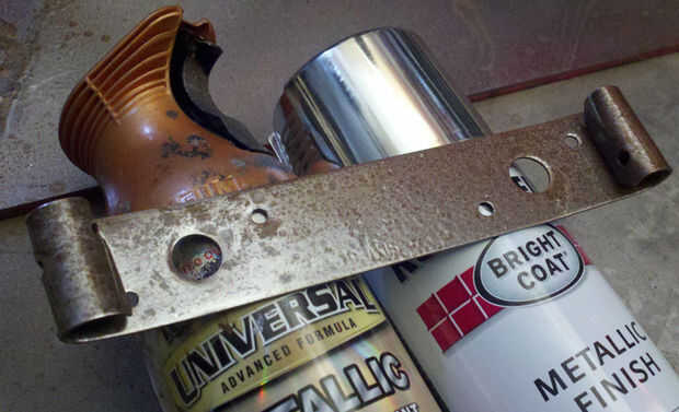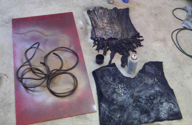 Directamente no pinto la acanalada cubierta (esa manguera negra en la foto) con las plantillas pero mantuvo lo suficientemente cerca para coger trozos de cualquier color de pintura me estaba rociando, luego haciendo un pase de un lado con cobre.