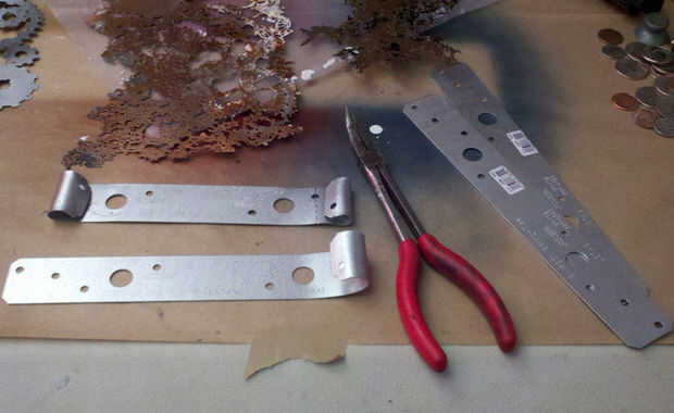 Ahora para esos tipo de soporte cosas recogido desde el techo sección-tuve que enrollar los extremos porque me gustó se ven mejores que plana. No utilizar las plantillas de cualquier textura sobre él-que sólo rocía las pinturas de cobre y plata a quemarropa, dejando que se superponen y reaccionan entre sí. No hay necesidad de pintar la parte posterior.