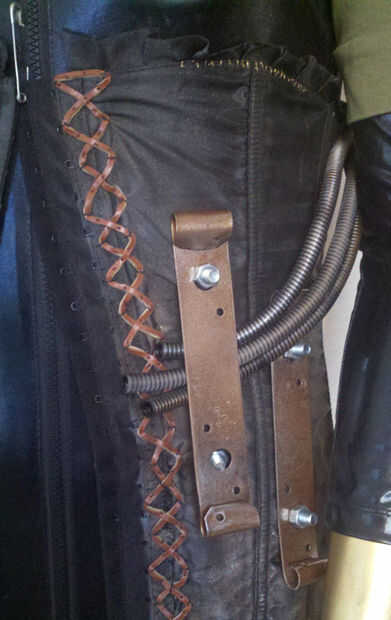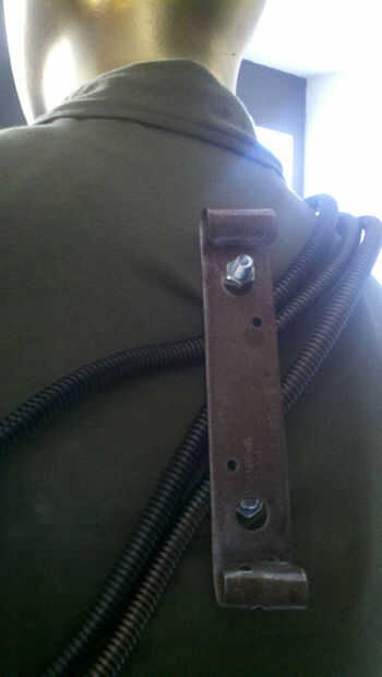 He hecho una pequeña incisión en la tela del corsé, tratando de un tornillo tornillo en el soporte. Las mangueras fueron simplemente se deslizó por debajo y aplanadas como aprieta los tornillos. Repita para el segundo soporte corsé, parte posterior de la verde oliva encogiéndose de hombros y frente del traje.