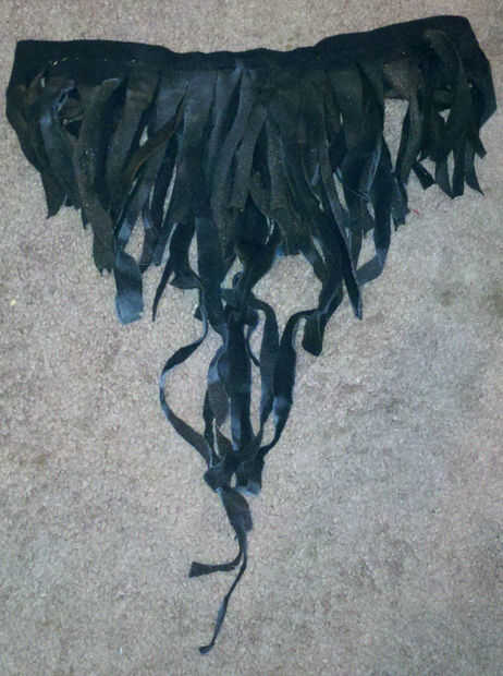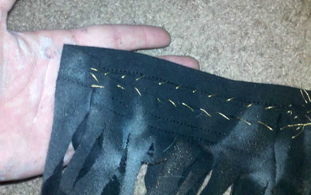 Tenía una tira de material tipo cuero bronceado que cosido en la parte delantera en forma de zigzag por ninguna razón. Buen contraste, pero en el momento, lo hice sin razón.