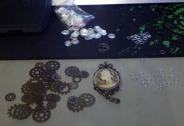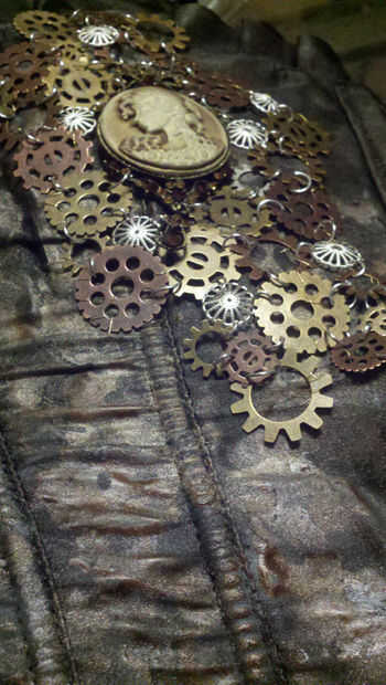 El detalle del corsé lleva un rato, pero he recibido muchos cumplidos en él. Compré un paquete de corte de engranajes de la tienda de artesanía, además de algunas anillas mueren. Ambos eran tal vez $6 después de impuestos. Me ha pasado que tiene una bolsa de Casquillas de plata y el cameo en mi cubo de arte, así que los de allí tiré. Abre unas anillas y empieza a juntar las piezas al azar los resultados juntos. Una vez terminé, me coloca en mi corsé e hizo el hilván a mano alrededor de cada otro hallazgo.