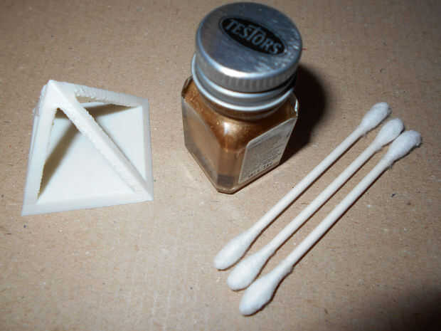 Usé pintura de modelo de Testors para mina de color oro (comenzó como blanco). Quería algo que recordaba la nave pirámide oro en StarGate. Usé un hisopo de algodón y le dio un par de capas. No ir por la borda con la pintura como un poco va un largo camino. Es mejor poner más capas finas que una gruesa y goopy.