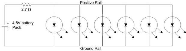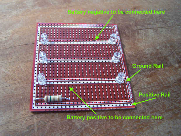 Cada LED tiene 2 cables, con un cable más corto que el otro. Los LEDs están conectados directamente a los carriles de alimentación positivo y tierra con el cable corto de entrar en el carril de tierra.