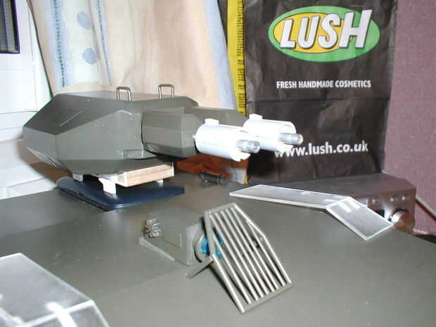 Los remaches fueron coser cabezas de perno y el misil claro marquesinas fueron hechas de cajas de CD, como era el parabrisas. El portador turrett era una mezcla de MDF, cajas de CD y plásticos arquitectónicos, mientras que los bozales fueron cortados de pipas plásticas del agua.