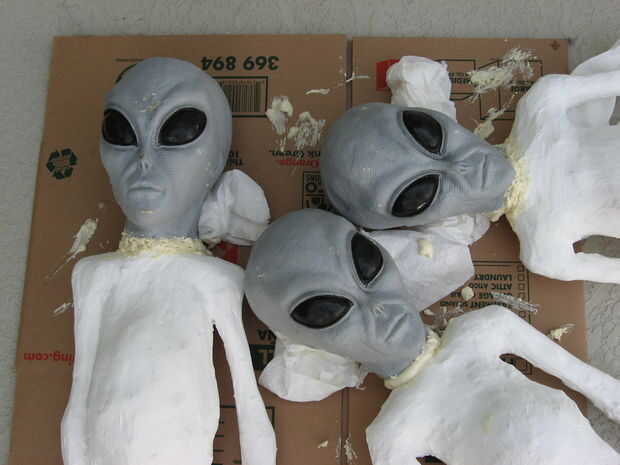Adhieren de la cabeza de espuma comprada colocando la cabeza del hueco en el cuello de tu alien y rociar espuma de expansión dentro de la cavidad de la cabeza y el cuello. Hacer un poco pequeño a la vez. Continuar agregar la espuma de expansión alrededor de la zona de cuello y hombros para que la cabeza no se ve demasiado grande y para dar soporte a la cabeza.