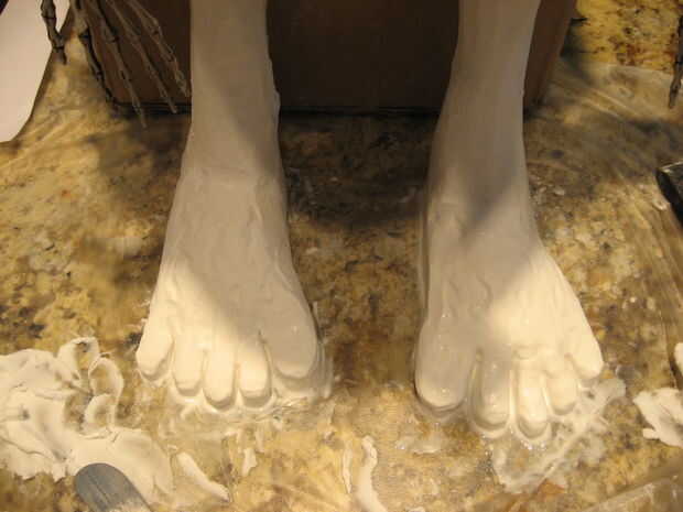 Con arcilla de modelar, crear las manos y los pies. Levantó al alienígena en una caja al crear los pies para que pudiera empacar la arcilla alrededor de las patas esqueletos y asegurar una superficie de fondo plano de los pies. Forrado la parte inferior de la caja con papel de cera (de modo que los pies no le pegan a la cartulina), los levantó y corrió una cinta alrededor de su cuello y a través de dos orificios en la parte posterior de la caja de modo que se quedaría vertical. No trate de dejar su alien levantarse por sí mismo hasta que la arcilla se ha secado durante al menos dos días. Que tenga que añadir algunos arcilla a partes de los pies y hacer unos funcionamientos de ensayo antes de llegar a pararse sus propios.