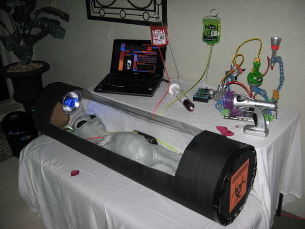Hola a todos, aquí hay unas fotos de un guerrero alienígena y huevos de la película 'Aliens' que mi novia y yo para nuestra fiesta de Halloweenel extranjero está construido de alambre de pollo, luego papel mached luego detalle añadido mediante pegame