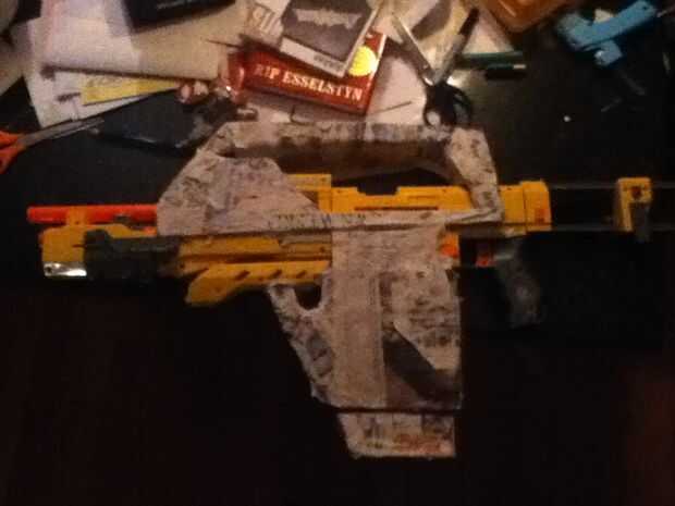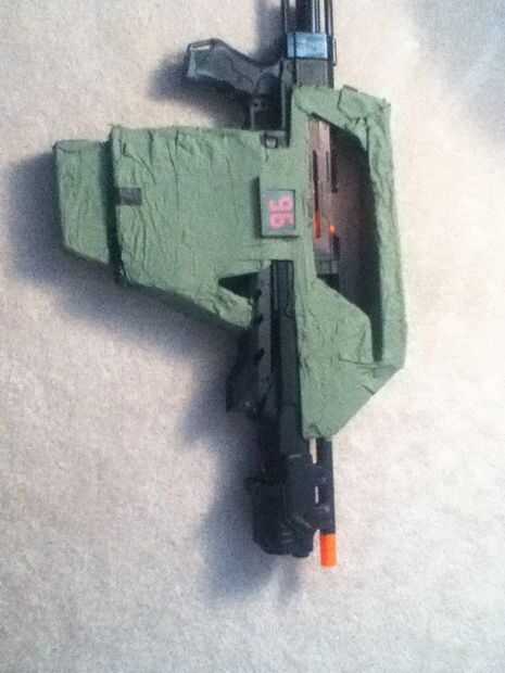 pongo papel maché alrededor de la cartulina para obtener la forma correcta. Al principio había pintado el negro de la pistola y el papel maché verde oscuro que era una mala Idea, porque parecía a oscura. El color real de la parte de maché de papel es un color camo, encontré algunos pintura en walmart, y fue perfecto. el clip del amo era la misma.