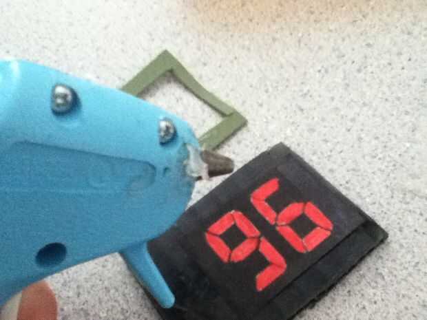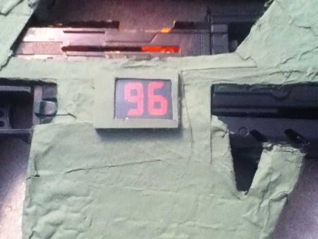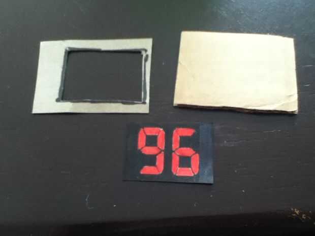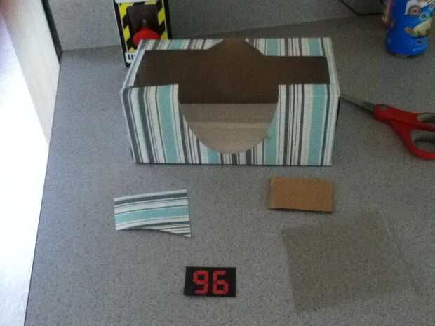 el contador se realizó mediante el uso de dos piezas de cartón, un recipiente de fresa y una imagen impresa. en mi ordenador he hecho una foto del contador. y lo imprimí. Cortar un cuadrado de la cartulina que se ajustan a la forma de papel impreso. Entonces yo cortar un pedazo del recipiente fresa para la pantalla. Pinta el cartón del color de la pistola y había pegado los pedazos juntos y luego en la pistola.