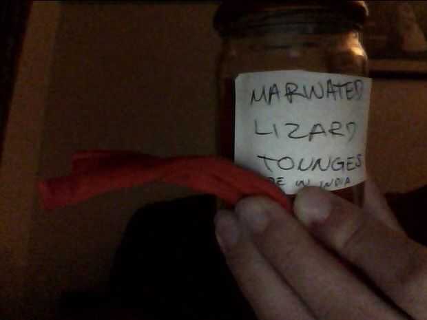 cortar formas arcos finos de la tela roja como lagartos tounges. trazar la línea de la lengua con el texta negro. poner en tu tarro * y usted puede cualquiera lable por escrito el nombre y pegar en. o podría escribirlo y hacer un agujero con la perforadora y fíjelo con una cuerda.
