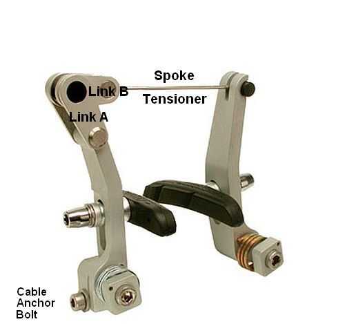 Para ajustar el ángulo de enlace A, el tensor de radios puede ser liberado de un brazo y atornillado dentro o fuera de sus temas en el enlace B para ajustar la distancia entre los brazos de dos freno. Esto también afectará las pastillas de freno para llanta distancia que requiera un ajuste adicional del cable de freno con el tensor. Se desea probar la bicicleta entre los ajustes para encontrar lo que se siente mejor para usted. Puede tomar varios intentos para llegar apenas a la derecha.