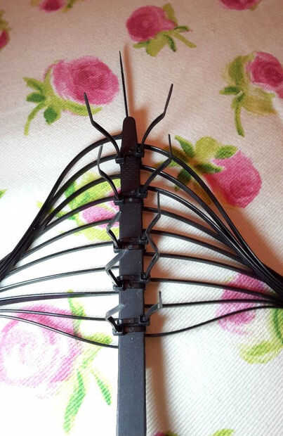 Se unió a las dos partes junto con varios más pequeños alternando lazos zip hacia abajo, colocado entre franjas de las alas (fotos) (utiliza 10 de ellos pero se pueden utilizar tantas como quieras). Crean nuestras patas de SRI;