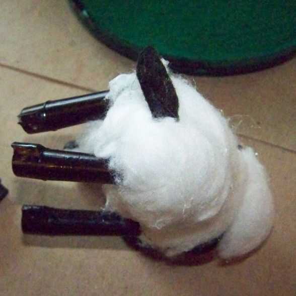 Snap o cortado de la parte delgada de las tapas de pluma y pintura los tapones de los bolígrafos negro, entonces utilice una pistola de pegamento caliente para pegar las patas al algodón para él estará parado para arriba.