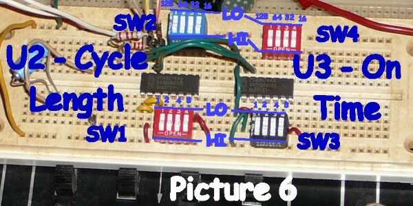 Aquí está una tabla que muestra los valores de los interruptores individuales en SW1 y SW2 conectados a U2 para fijar la duración del ciclo. Esto supone que han construido circuito de la misma que la mía y los interruptores DIP han orientado la misma manera como se muestra en el cuadro 6.
