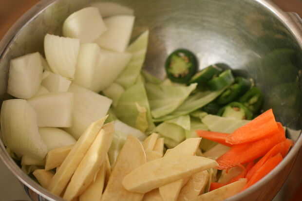 Mientras que el pollo es marinado puede cortar encima de las verduras (si no lo has hecho ya).  Dejar reposar hasta que se necesite.