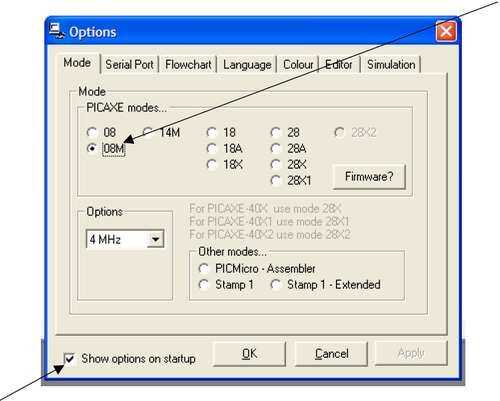 Diálogo de las opciones se abrirá automáticamente (si está marcada la casilla "Mostrar opciones de inicio"). Si no lo hace, vaya a ver > opciones. En la ficha modo, seleccione M 08--este es el microcontrolador PICAXE.