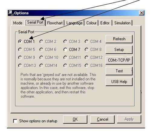 Haga clic en la pestaña de puerto serie y seleccione el puerto COM donde está conectado el Cable de programación USB. Haga clic en el botón Ok para ir al editor de programación. En el editor de programación, haga clic en archivo y haga clic en nuevo diagrama de flujo para empezar a entrar en el diagrama de flujo.