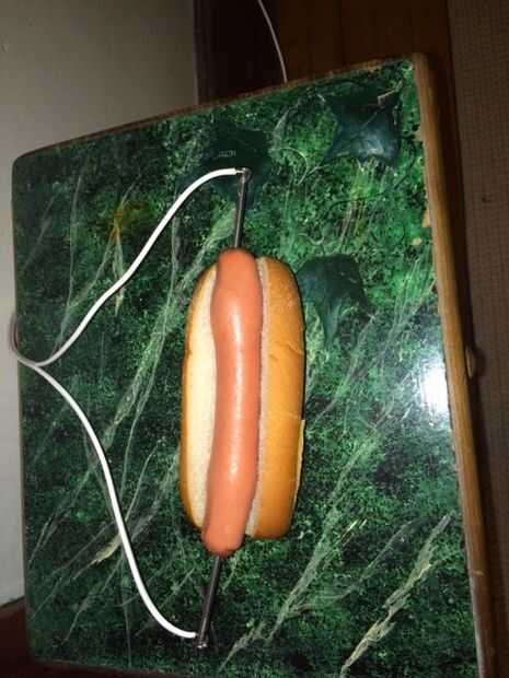 Con el perro caliente en el pan y las dos uñas en el perro caliente, conecte el cable de la lámpara