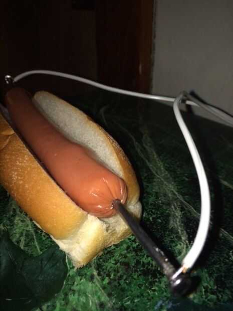 Antes de conectar este dispositivo de empuje los clavos en cada lado del perro caliente y colocar el perro caliente en el pan.