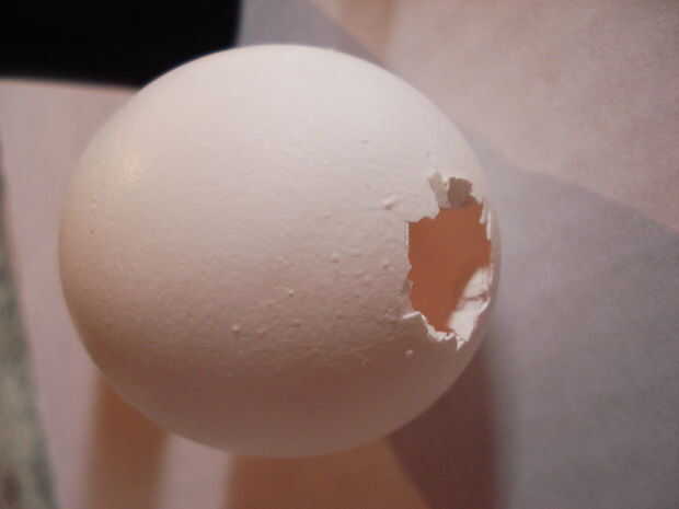 Esta parte es bastante simple. Tome un huevo y la tachuela y utilizar la bordada para meter 2 agujeros, uno en la parte superior y en la parte inferior. El orificio superior no tiene que estar centrada, pero su tipo de importante que el orificio está en el centro porque el LED se colocará en esa parte. Aquí es donde usted puede utilizar el pincho para hacer el agujero en la parte inferior más grande, de esa manera que pueden soplar los mocos del huevo fuera de él. Derecho, tienes un huevo con dos agujeros, pero esto es donde se convierte en sólo un poco de diversión. Soplar en el orificio superior, que causa el moco al ser empujado por el orificio de la parte inferior. Cuando el huevo es hueco y seco, utilizar la virada por avante o la brocheta para hacer el agujero en la parte inferior apenas el tamaño correcto para el LED encajar en él. Ahora en el siguiente paso!