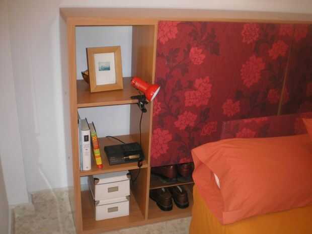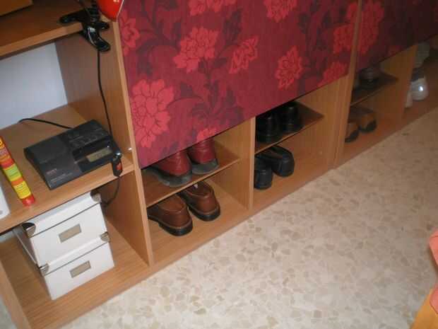Un espacio es necesario para acceder a los zapatos, así que añadí otro tablero tapizada para cama con tres tornillos (y también las almohadas no caen).