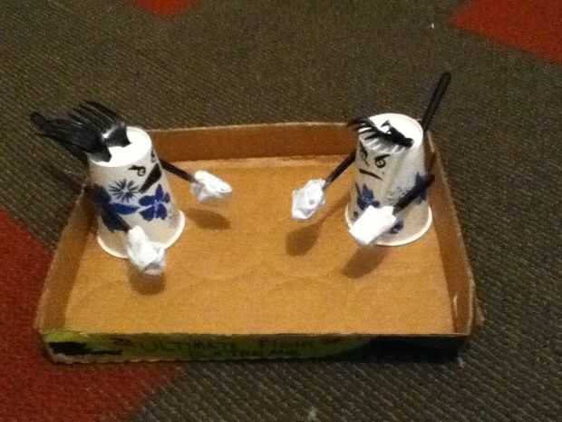Necesita una caja de cartón pequeña, 2 vasos de plástico, 6 tenedores de plástico, 2 piezas de papel, cinta adhesiva y un rotulador si desea enfriarán diseños.