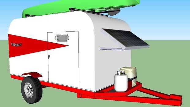 El Vetsport Microcamper está diseñada para acampar fuera de la red y puede ser equipado con un panel solar, batería de ciclo profundo para el almacenamiento de energía y gas propano para cocinar y calentarse.