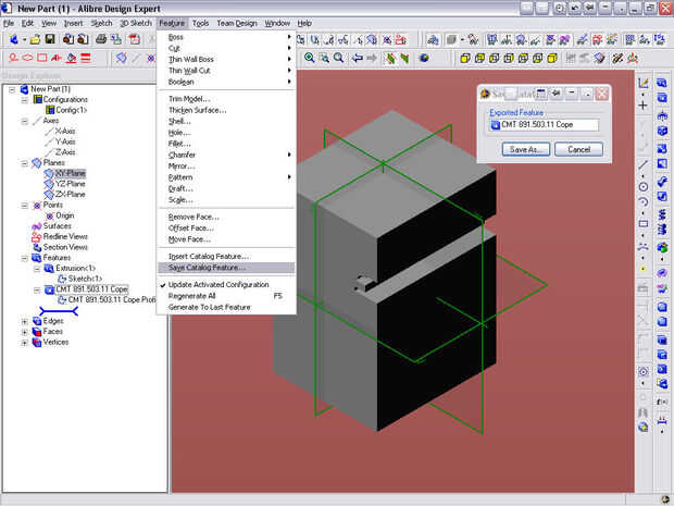 Una vez que se crea la corte saca, resalte la función Extruir corte y seleccione en el menú, función > Guardar función de catálogo. Esto creará una característica del catálogo similar a cuando la creación de un bosquejo. Nombre de la función de catálogo con un nombre descriptivo que posiblemente contenga la palabra corte para ayudar a diferenciarla de un perfil de función del catálogo de esbozo. Usted sabrá que el corte es de una extrusión porque a partir de la v9.1 de Alibre, no puede crear una función de catálogo de corte de otra cosa que una extrusión.