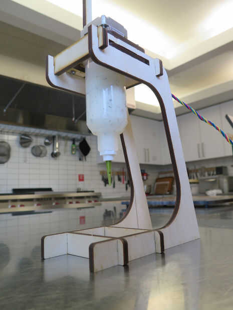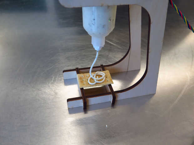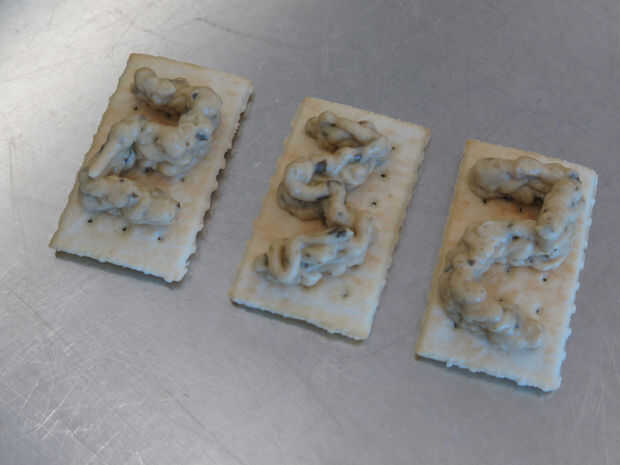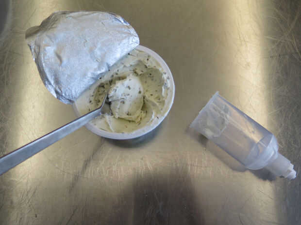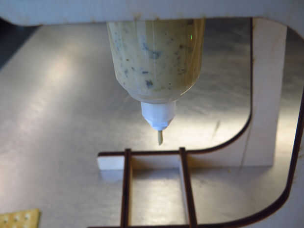 El segundo alimento extruido es hummus espinaca de alcachofa. Esto era más fino y fácil de sacar, pero tenía algunos trozos que obstruir la boquilla.
