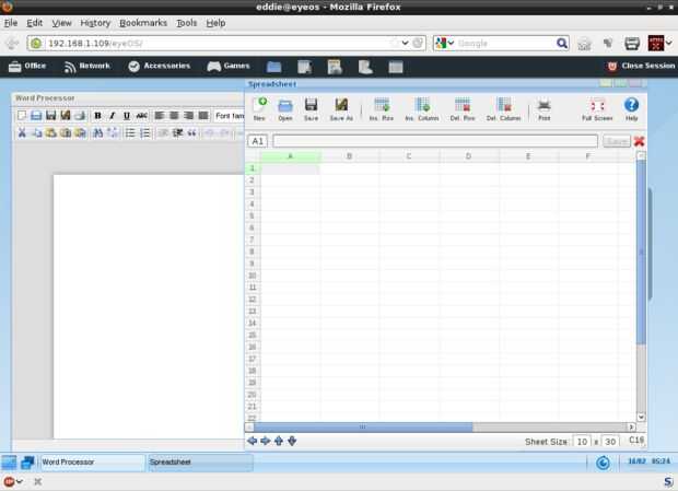 EyeOS es tipo de interfaz gráfica de usuario web por escritorio, tiene un procesador de textos, hoja de cálculo y muchas otras características. Es perfecto para touchpads, laptops y desktops incluso acceder de forma remota. es fácil de instalar también. No bases de datos de por sí a tratar. Me encanta para usar con mi touchpad (también conocido como el Chumby). Si lo usas en casa, realmente no necesita un montón de recursos a utilizar. De hecho, me encontré una versión anterior en un viejo Cisco Linksys Nslu2 (con debian etch instalado). eyeOS debe ejecutarse en más cualquier sistema que se runniing el servidor web Apache o similar. (es decir, MSWindows, OS / X, BSD, Linux o etc..)