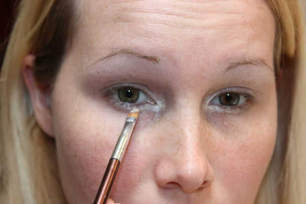 Primera) Aplique una imprimación para tus párpados hasta sus cejas. No te olvides de llegar debajo de los ojos también. No es indispensable, pero ayuda a conservar los colores y les impide agrupar. Luego tomar el pincel angular y aplique algunos blanco brillo en las esquinas internas de tus ojos y debajo de las pestañas inferiores del ojo. También añadir algunos bajo los arcos de tus cejas. Esto es donde la luz se centra en la mayor parte y apenas le hacen resplandor. El blanco también saca la parte blanca de los ojos.