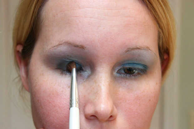 Cuarto Ahora es el momento para agregar un azul más definitorio. Eligió dos blues y me fui por todo el párpado con ellos. Cuando solía falta blanco cepillo, (mi mezcla), mezcla de todos los colores todo sobre el ojo. El cepillo de mezclado debe ser muy abombado, con el fin de no llevar color mientras ésta esté licuando. Si le sucede a despegar demasiado color, simplemente volver a aplicar.