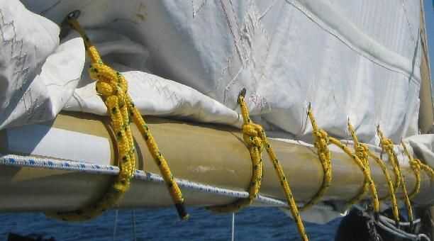 La fotografía muestra los lazos de arrecife acabado en su lugar, pasa por los puntos de arrecife en la vela y asegurado con un giro a través de los ojos y un par de medios nudos.