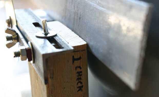 A cero, haga una marca en la parte posterior de la estructura vertical a una altura 0.125" debajo del centro de la muela. Ajuste el dial de ángulo a 0 grados y trabarlo en su lugar. Establece una regla sobre la mesa, afloje el tornillo que sujeta el selector de ángulo a la entrada de tabla pivote, ajuste la posición de la tabla hasta que la regla se alinee con la marca puesta a cero y apriete el tornillo de poste de ángulo dial-pivot.
