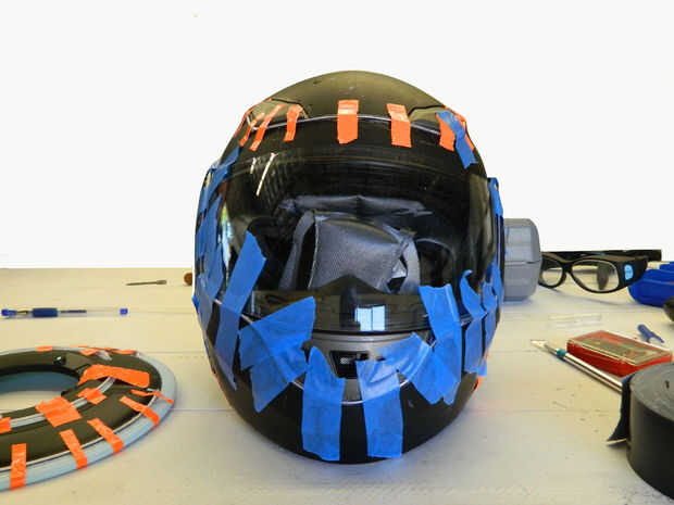 Utilizar una dremel para crear una ranura para el cable para sentarse (ver imagen adicional). A continuación, aplique el pegamento de E-6000 y mueva EL alambre a lo largo de la ranura del casco. Asegúrese de que cinta a medida que avanza. Recuerde dejar que el pegamento reposar 72 horas secar.