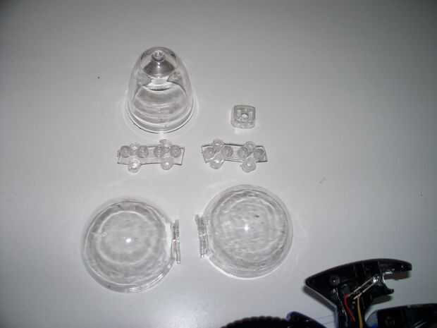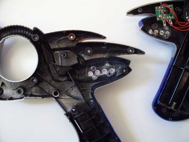 Retire las pilas y las piezas de plástico - las dos filas de luces en la parte trasera de la pistola se realizan con tornillos, todo lo demás sólo desliza apagado. ¿Retiradas estas, junto con todos los tornillos - ha estado ahorrando, correcto?