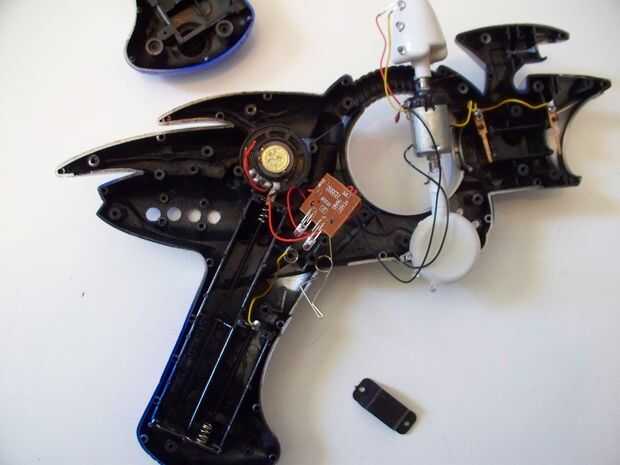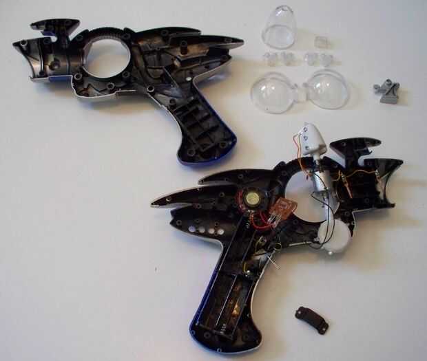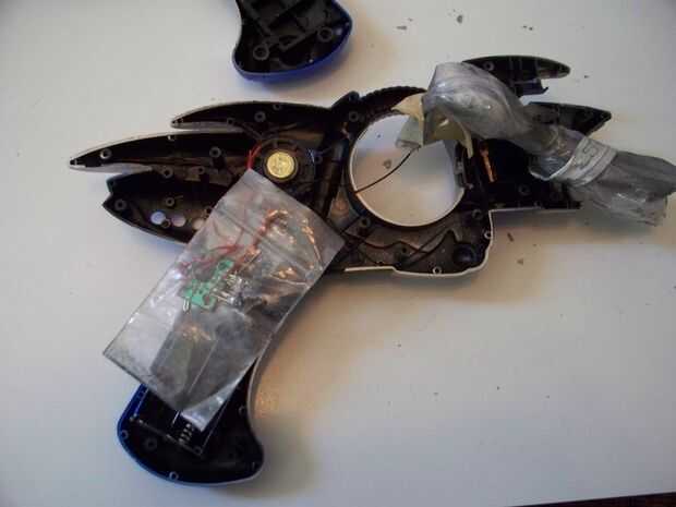 Después todos los bits electrónicos - todavía Unidos a la pistola - en bolsas de plástico y asegurar con lazos de torcedura o cinta. Si la "luz de láser" se ha aflojado, deben poder pop dentro de una bolsa con el pedazo de eje - si no, tendrás que cubrir con un poco de cinta.