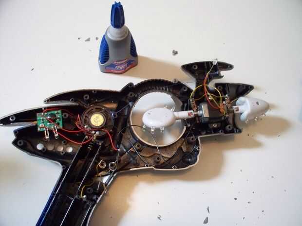 Una parte de la palmada sobre el otro y atornillar abajo - va ser desarmarla de nuevo, utilice tan sólo suficientes tornillos para asegurar los laterales encajan bien. Nota: tenga cuidado de no pellizcar los cables entre los pedacitos de plástico cuando vuelva a montar el arma - es fácil de hacer.