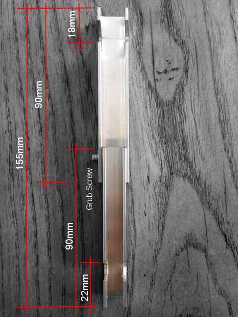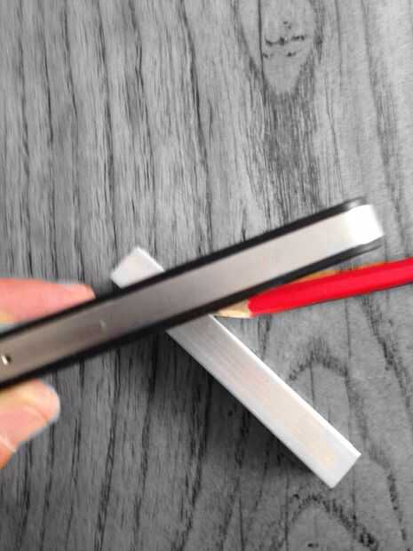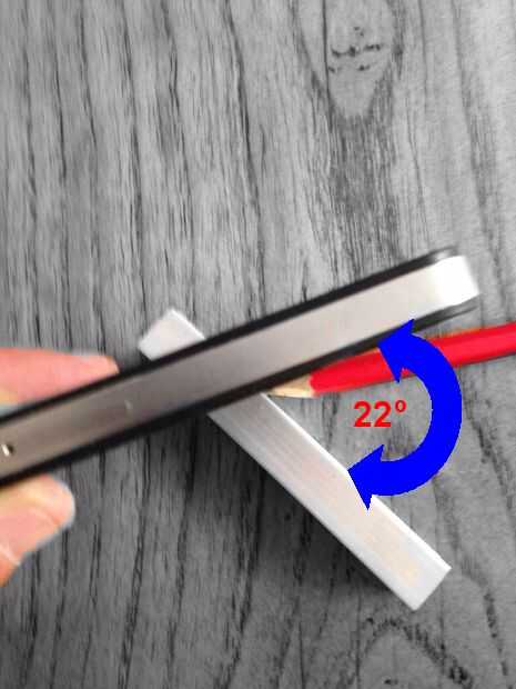 El grueso de los dispositivos portátiles varían un poco, así que una vez que has cortado tu canal 'C' a la longitud, el dispositivo en el lado del canal de 'C' se sienta y marque cada lado como se muestra en la imagen. Entonces usando la Sierra de mano, corte una ranura para encajar el dispositivo en el ángulo que se muestra (22 grados). Recuerde que cuando usted corta la sección del canal 'C' para el dispositivo, que corta dentro de las líneas marcadas; de esa manera el dispositivo no ser demasiado flojo y caerse.