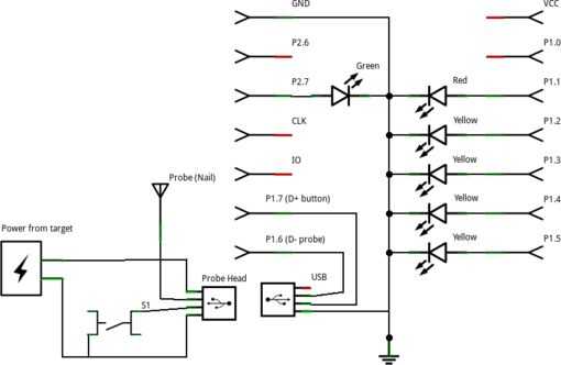 el esquema se compone de dos partes, en la que están conectados a través de un par de conectores usb. la izquierda esquemática muestra añadidos a la llave del EZ430 con un tablero F2012. el esquema de la derecha es la cabeza de punta de prueba lógica y debe ser construido desde cero.